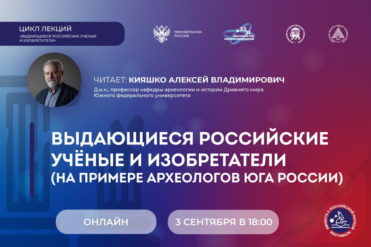 3 сентября 18.00 по ссылке https://vk.com/video-534603_456240397 состоится лекция доктора исторических наук, профессора кафедры археологии и истории Древнего мира Алексея Владимировича Кияшко в рамках которой слушатель узнает об одной из ярких страниц научной летописи донского края. Речь идет о феноменальной генерации учёных-археологов Ростовского университета второй половины XX века, которые начали исследование богатого наследия прошлого нашего края: поселений каменного века, городищ античного периода и средневековья и, конечно же, уникальных курганов бронзового века. Многие из этих учёных стали ведущими специалистами в своих отраслях археологии, их труды и достижения получили мировую известность.